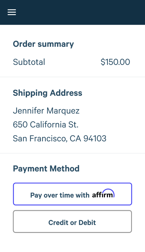 Select Affirm at checkout, then enter a few pieces of info for a real-time decision.
