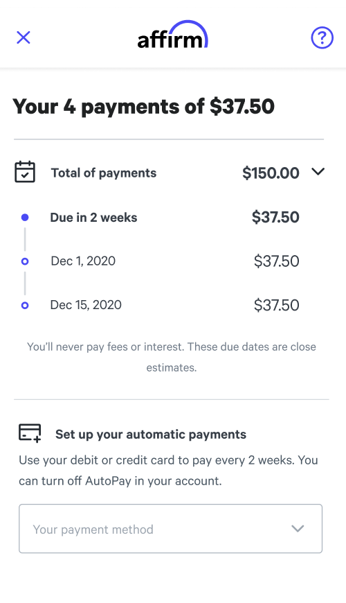 Affirm won't charge you late fees or penalties of any kind, ever.