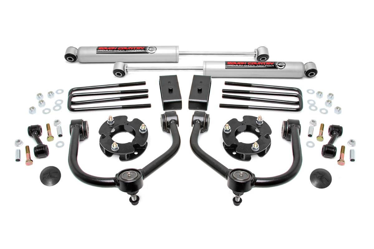 Rough Countrys 3in Bolt-On Kit offers easy installation and aggressive good looks at an incredible value. Take your truck to new heights with this excellent option for standard Nissan Titan pickups.This kit features a set of high-quality: tubular Upper Control Arms designed to make alignment adjustments easier and Clevite rubber bushings for enhanced durability. These arms are designed to promote a factory-like geometry by keeping the ball joint at optimum angles after lifting. This design allows for an improved: greater range of motion from the ball-joint: with less stress: wear and tear.Also included are a set of durable strut spacers and fabricated rear blocks to provide lift height from front to rear. Once installed: this kit gives your truck plenty of ride height for up to 33in tires while offering a clean: level look from front to rear.This all-inclusive kit comes with everything you need: and installation is a piece of cake compared to other kits on the market! Featuring a 100% bolt-on installation process that requires zero cutting or drilling: this kit can be installed using common tools in a home garage: and allows the truck to be returned to stock at any time if so desired. Best of all this kit features Rough Countrys Lifetime Replacement Warranty.