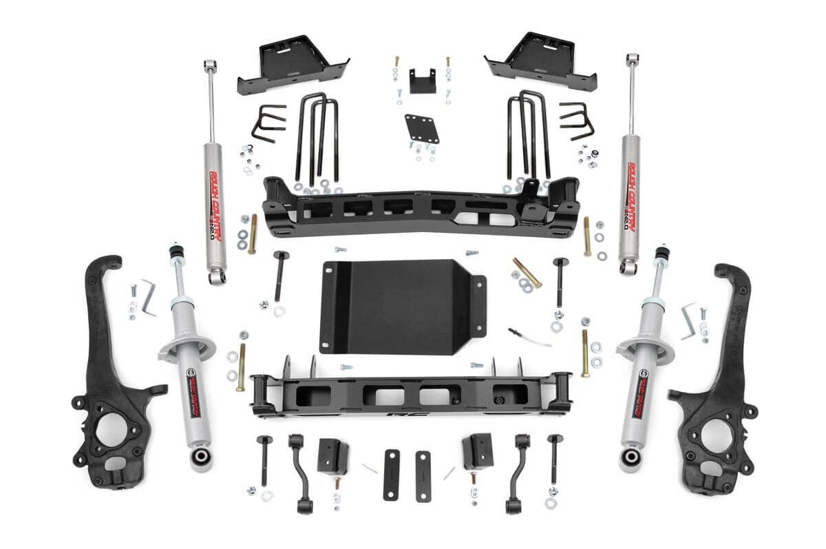 Release your Nissan Titans inner beast with Rough Countrys 6-inch Suspension Lift! This durable: all-inclusive lift kit comes with everything you need for smooth off-road performance and aggressive good looks. Featuring beefy lifted knuckles and unrelenting front and rear crossmembers: your Titan is ready for the road less traveled. This kit also features a Differential Skid Plate: Fabricated Lift Blocks: Brake Line Brackets: and more! Gain increased ground clearance and enough ride height to run up to 35-inch tires. This kit includes Rough Countrys Lifetime Replacement Warranty!