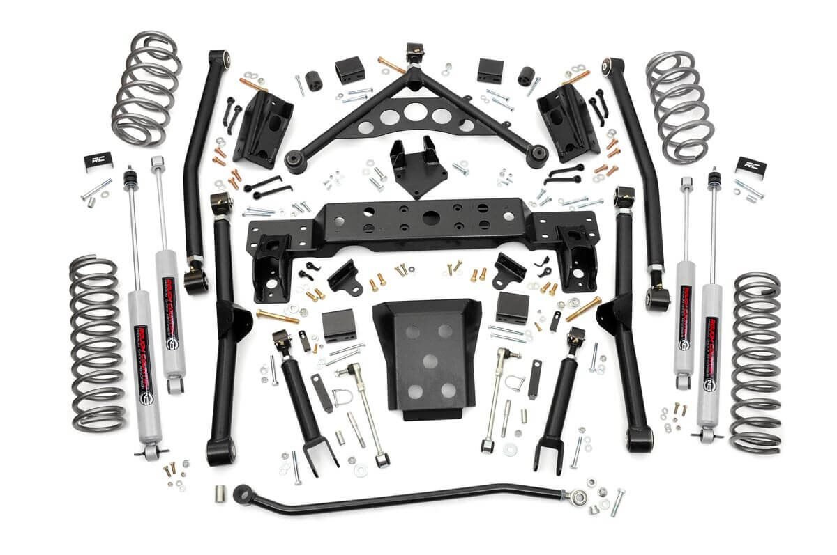 The long awaited WJ 4-inch Longarm Kit is a comprehensive package including everything needed for a great suspension lift while maintaining the vehicles crucial center of gravity. Upgrade your WJ and gain aggressive looks: extreme flex: and enough ride height to run up to 31-inch tires. The kit includes adjustable high-clearance X-Flex upper and lower control arms with Clevite bushings: featuring rebuildable X-Flex joints with Adjustable Retainer Rings and preloadable bushings. The kit also includes front and rear coil springs: a front adjustable track bar with drop bracket: 1/4-inch thick steel crossmember: skid plate and sway bar disconnects. Outfitted with Rough Countrys Performance N3 shocks: this Longarm Lift Kit is a total solution comprised of top-notch components designed for the avid off-roader who wants the most out of their WJ.