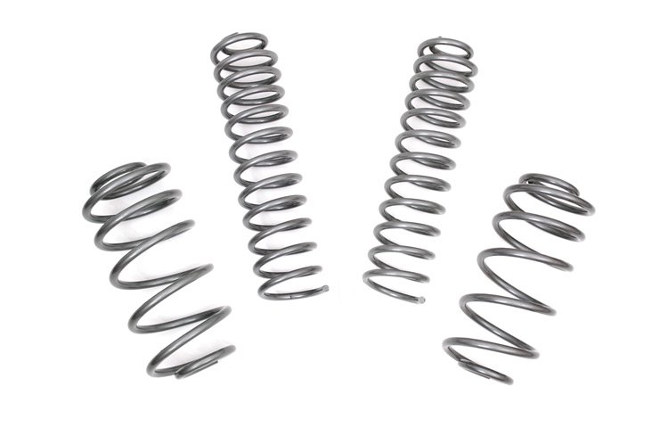 The progressive rate coil springs are the key to giving a lifted Jeep a great ride without compromising stability. This functionality is accomplished by designing the first few coils to compress at 115-lbs-per-inch and progress to 160-lbs-per-inch during further compression. The first inch of compression reacts to smaller bumps common with on-road driving and the spring`s progressive qualities react when further compression is required.